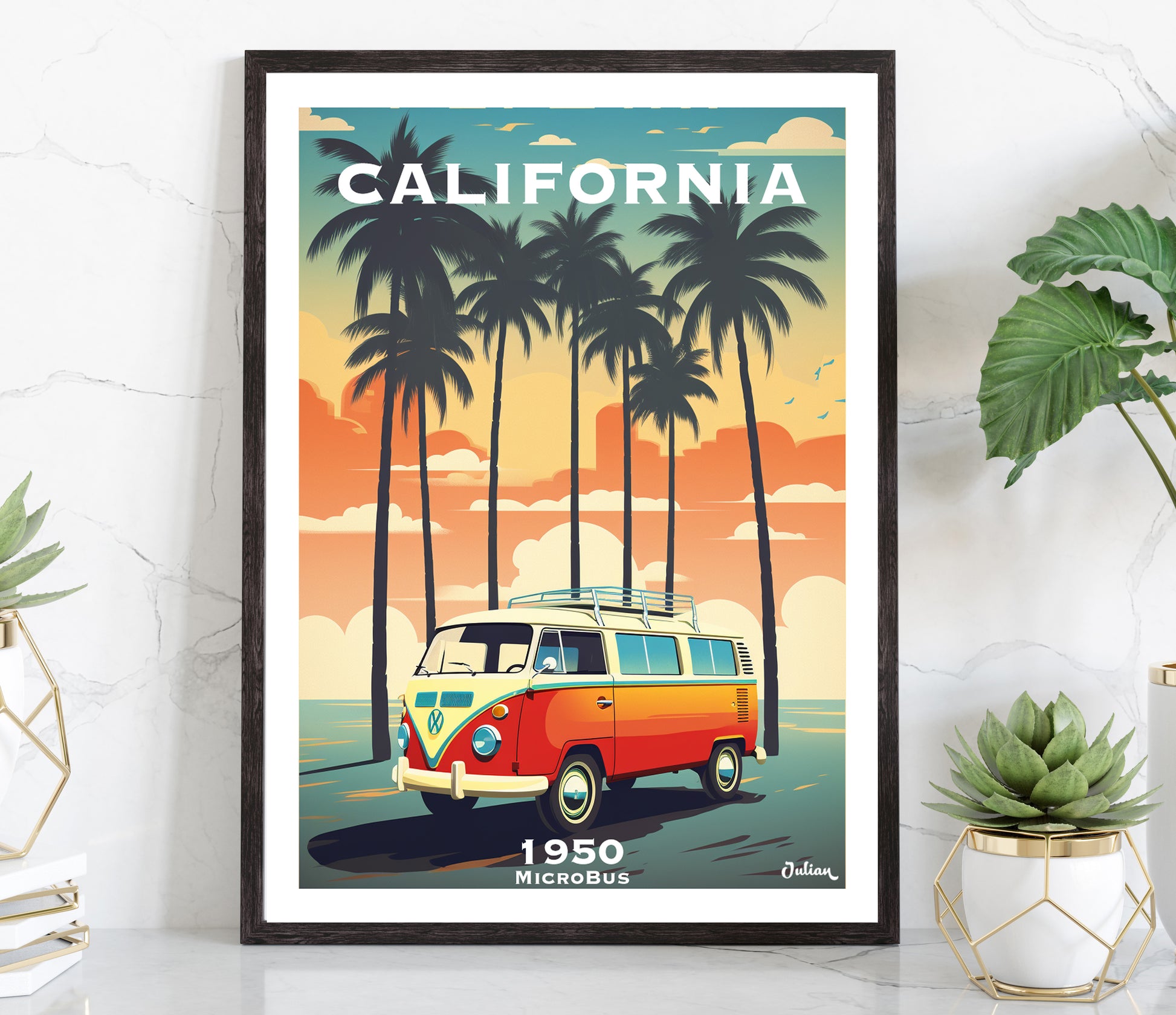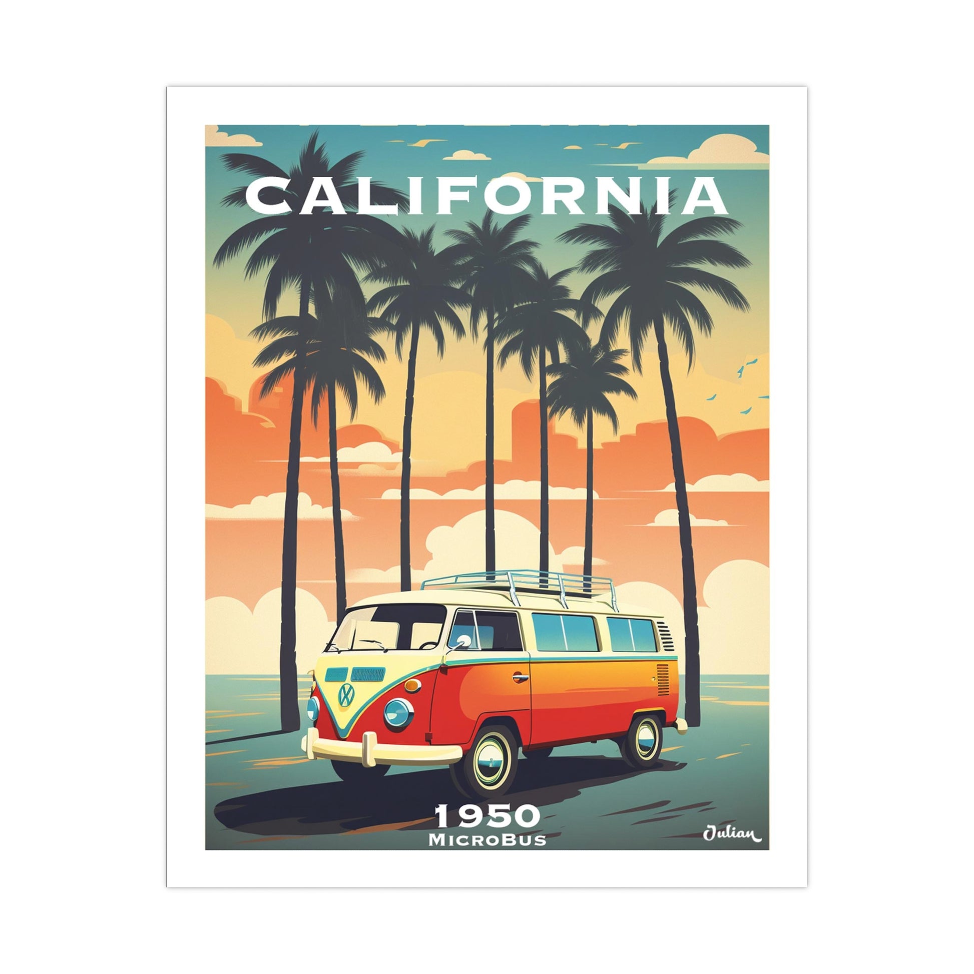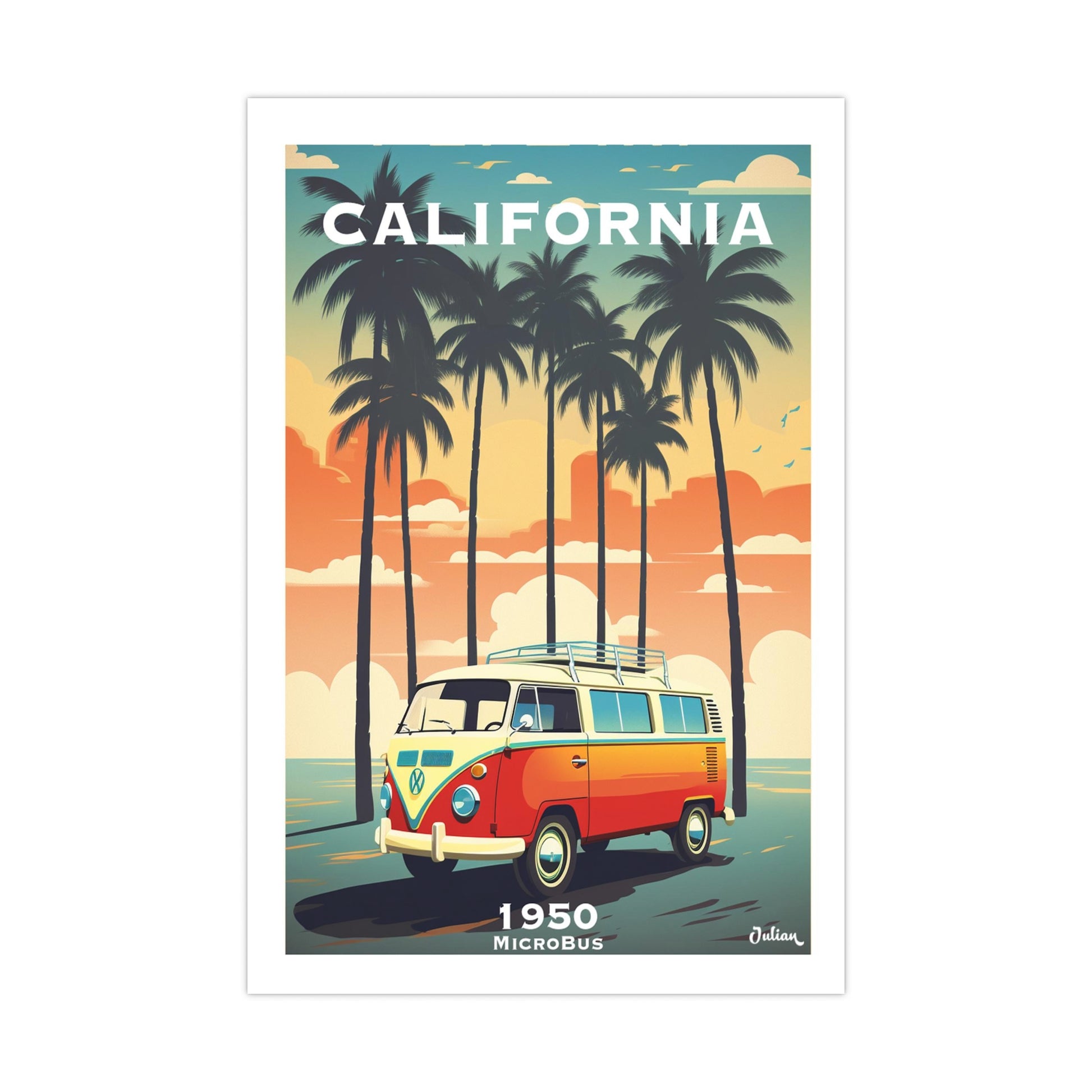 This poster is more than just a depiction of a vintage vehicle; it's an invitation to embrace the joy of exploration, the beauty of the journey, and the timeless appeal of California's landscapes, all embodied in the enduring symbol of the VW Microbus.