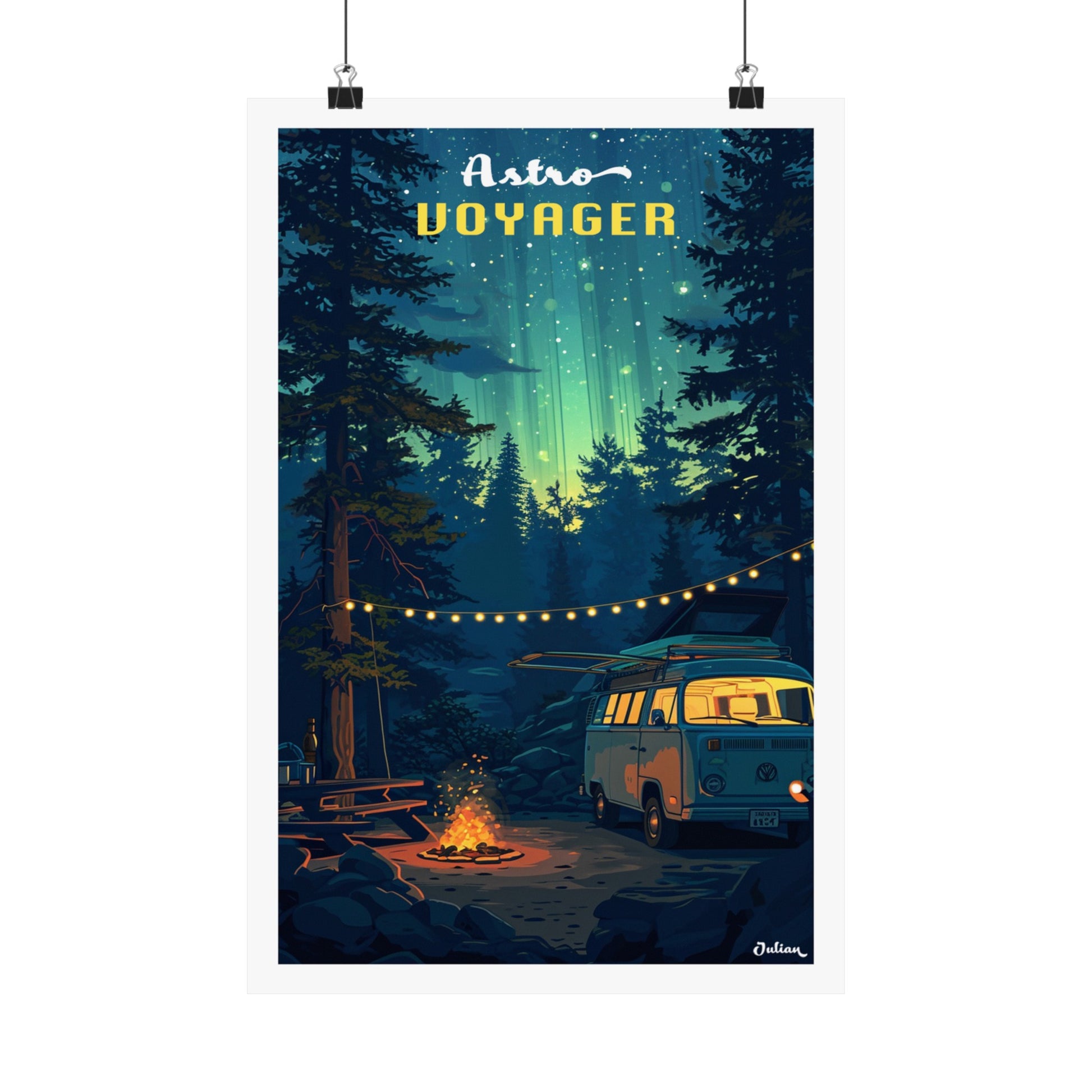 Gaze upon a captivating travel poster featuring an Astro voyager beside a crackling campfire, set against the mesmerizing backdrop of the aurora borealis. From a secluded forest, the vibrant greens and purples of the northern lights dance across the sky, illuminating the night with cosmic wonder.