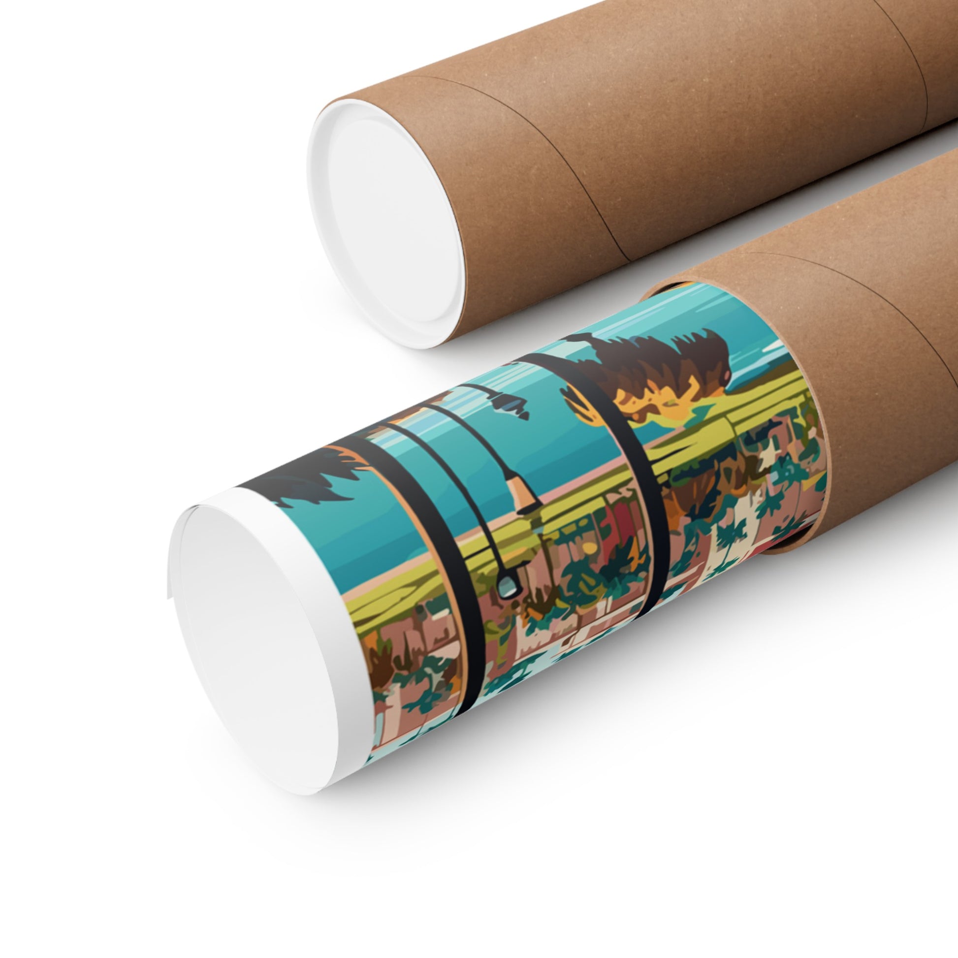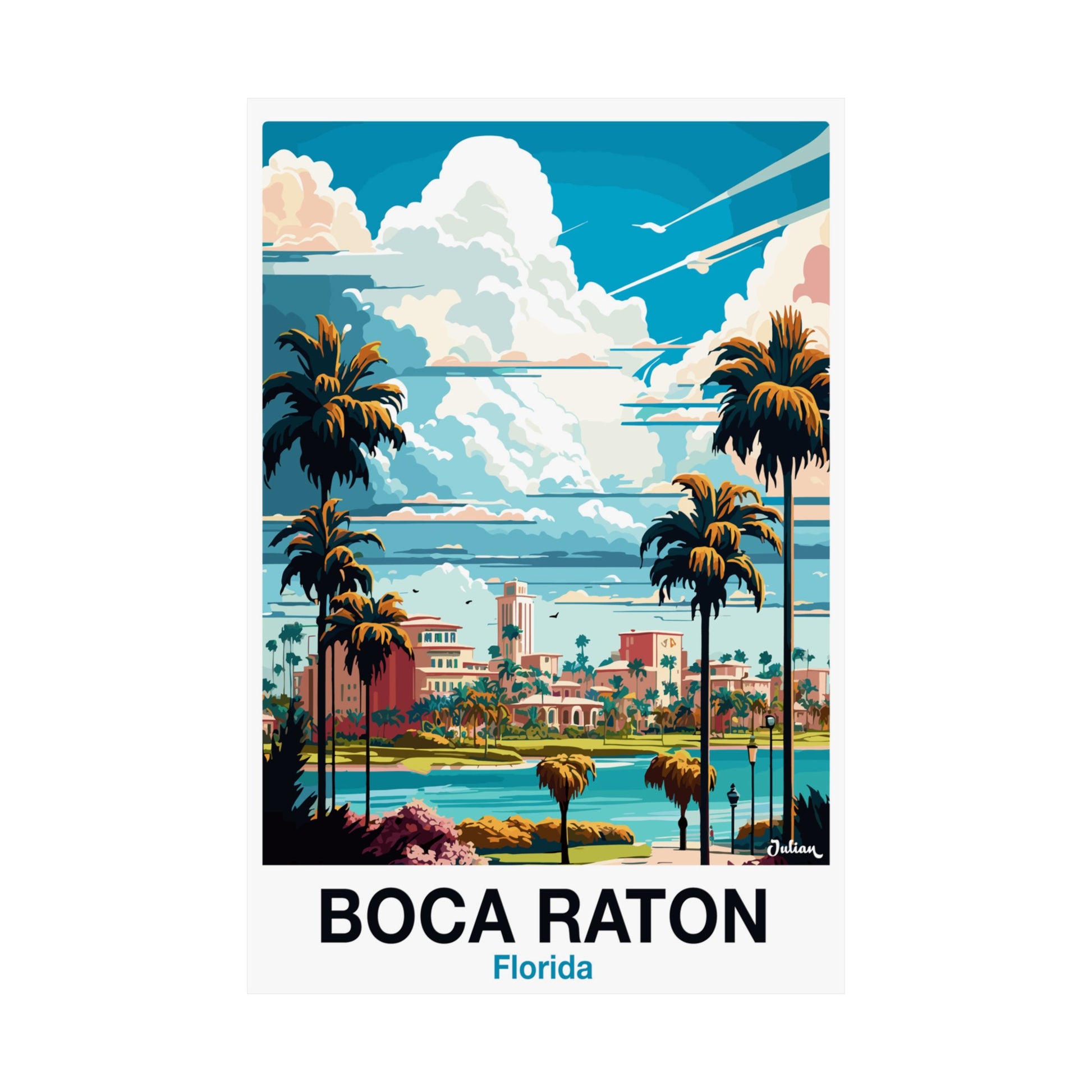 Explore the refined elegance of Boca Raton, Florida, through a captivating travel poster that highlights the city's lush water canals. Graceful palm trees line the banks, their fronds swaying in the gentle breeze, framing the serene waterways. Elegant buildings reflect off the tranquil surface of the canal, showcasing Boca Raton's blend of modern architecture and tropical beauty.