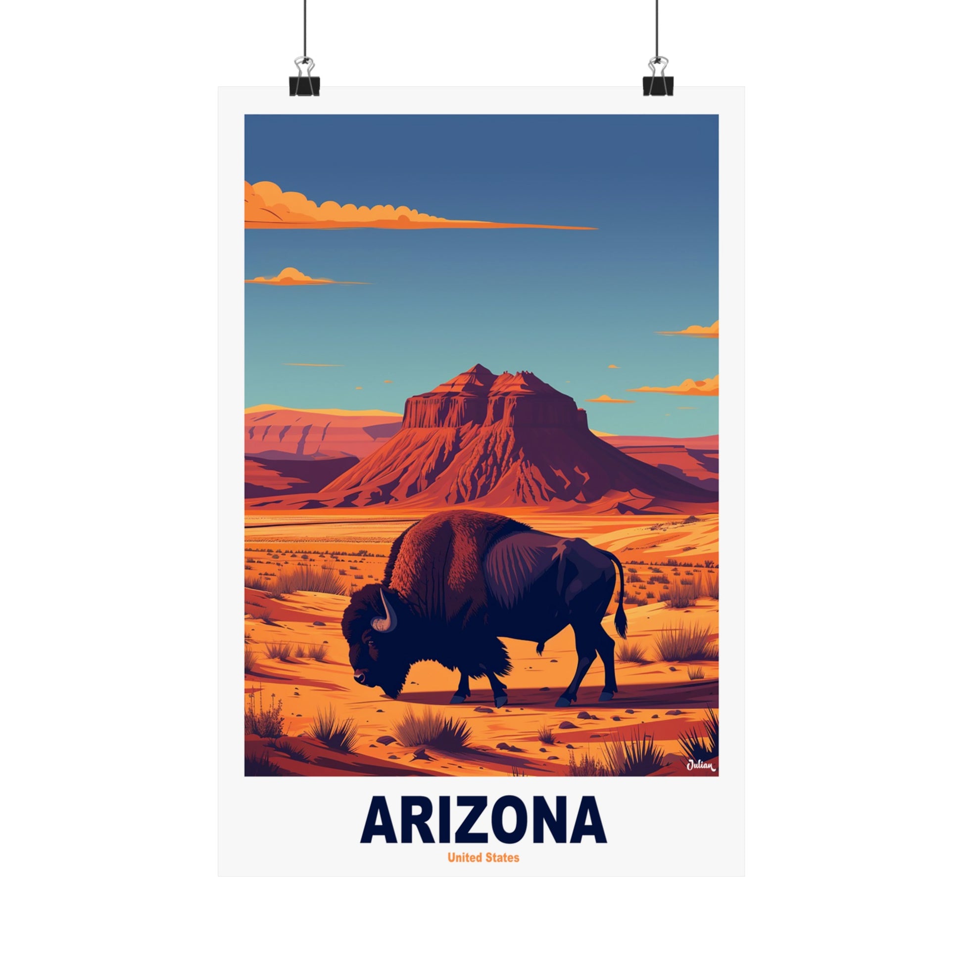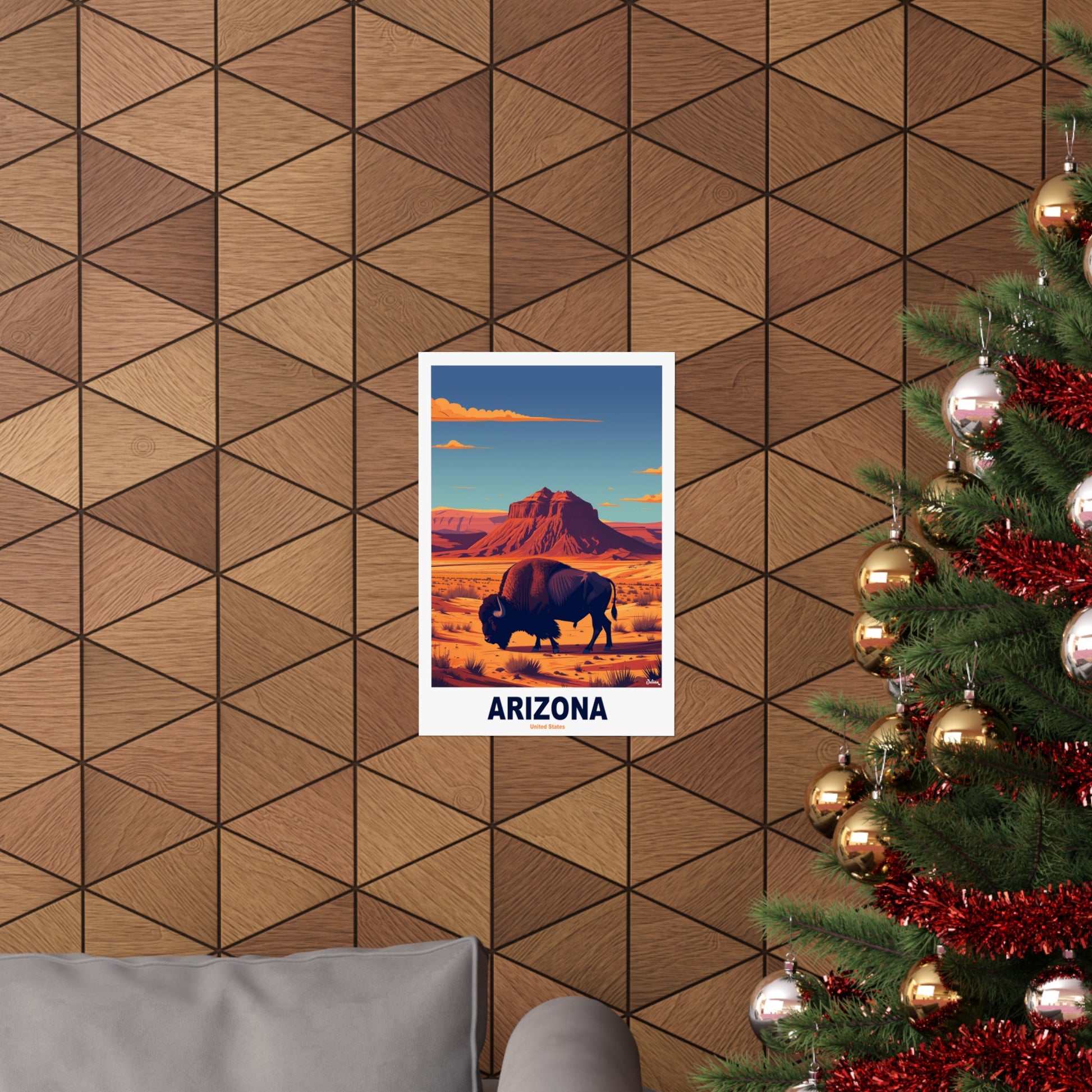 Experience the wild spirit of Arizona with this captivating travel poster, featuring a majestic buffalo standing boldly in the foreground. Behind this impressive beast, the iconic red rock mountains of Arizona rise dramatically from the desert floor, embodying the rugged beauty of the American Southwest.