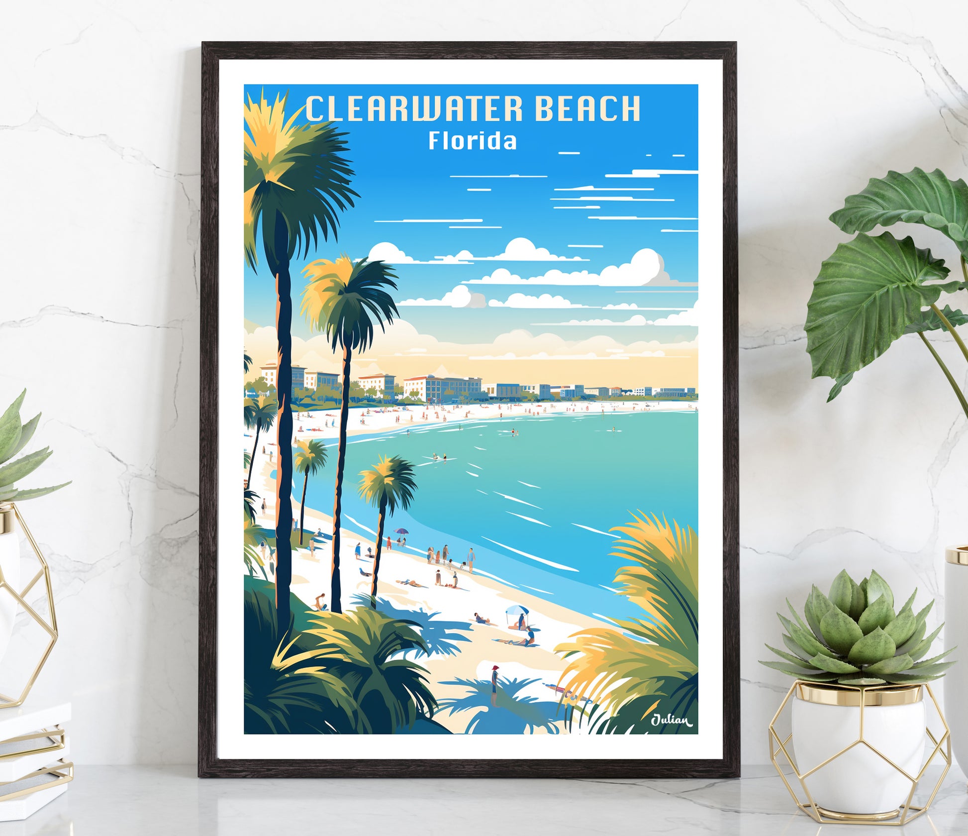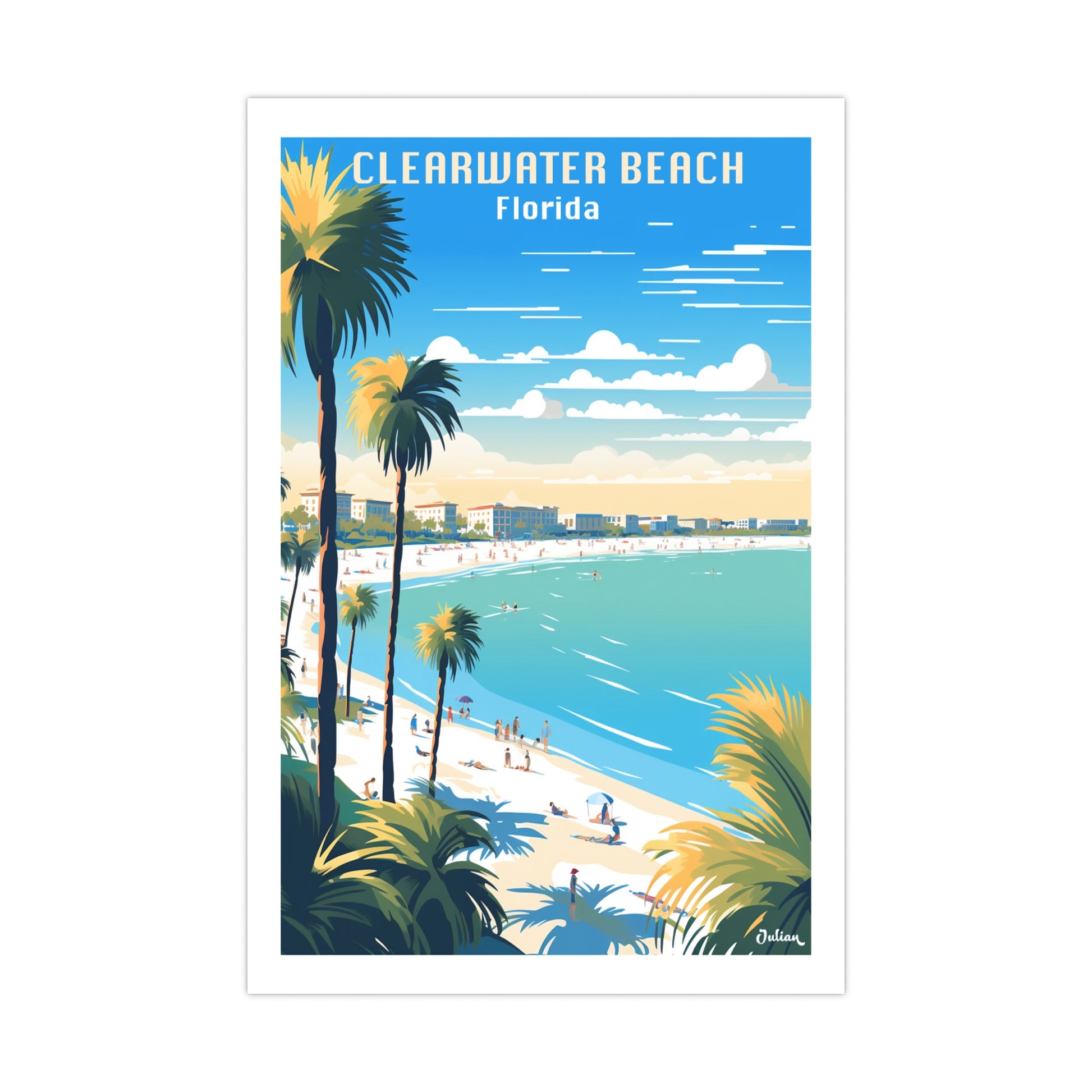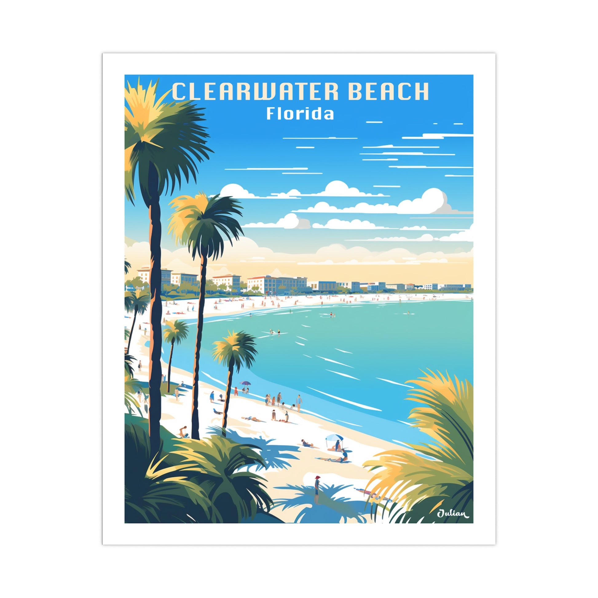 Picture a travel poster that captures the sun-drenched allure of Clearwater Beach, Florida, where miles of powdery, white sandy beaches meet the gentle azure waves of the Gulf of Mexico.