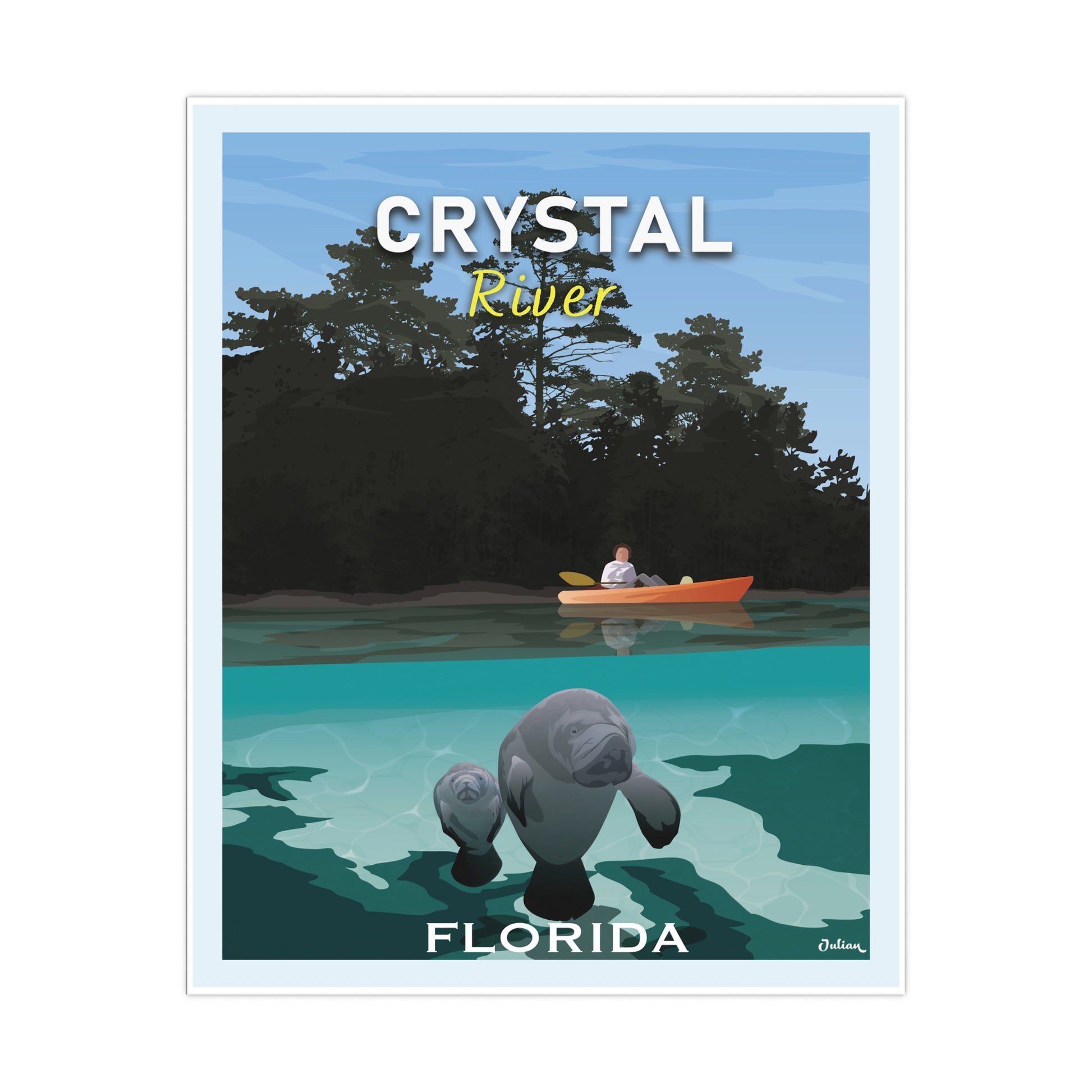 The travel poster of Crystal River, Florida, beautifully showcases the serene and natural allure of this idyllic destination, renowned for its clear waters and gentle manatees.