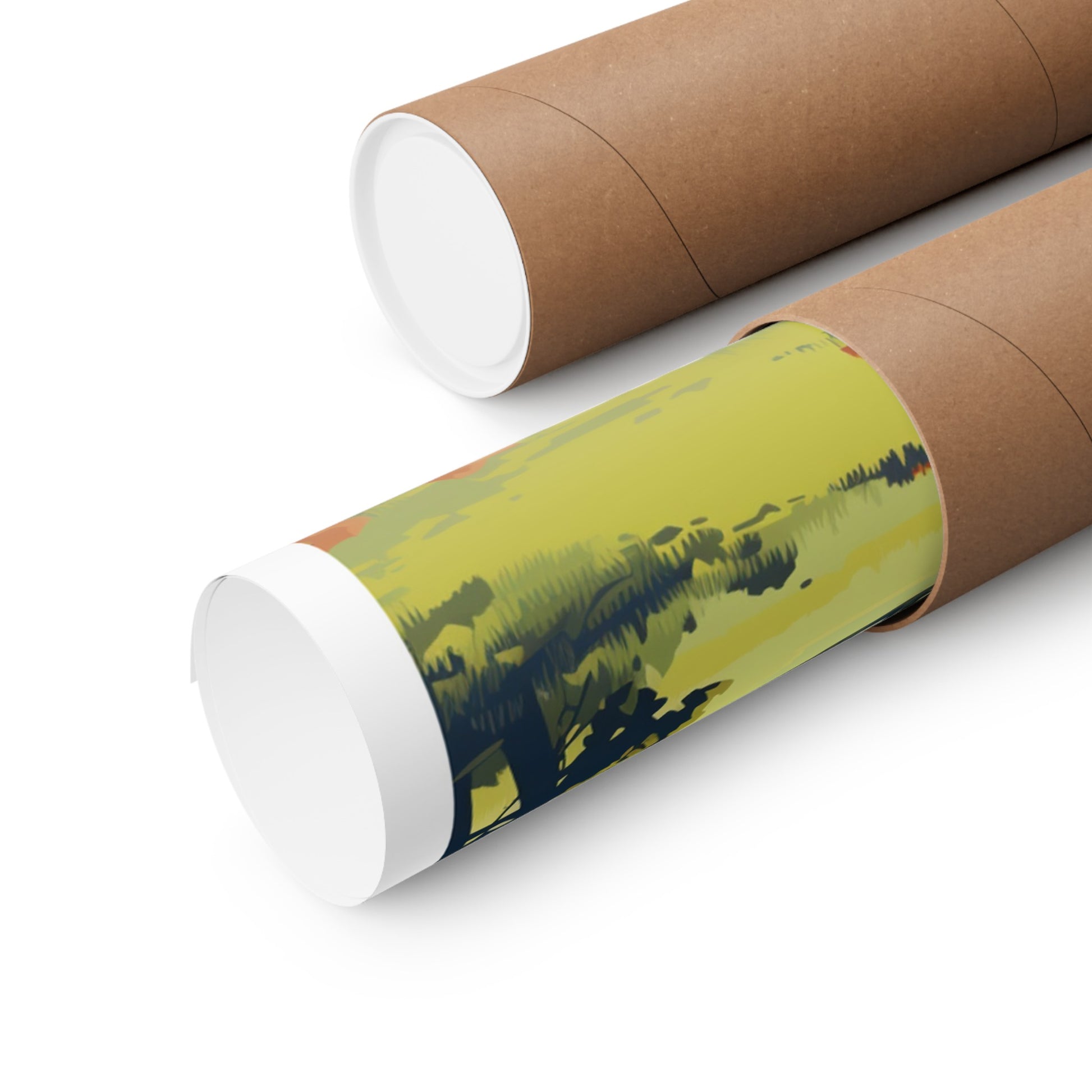 Behold the majestic presence of Devils Tower in Wyoming, a striking geological feature that rises dramatically against the expansive plains. This iconic monolith, revered by many Native American tribes, dominates the landscape in this travel poster, inviting adventurers and nature enthusiasts to explore its unique, columnar basalt formations and the serene, star-studded skies that envelop it at night.