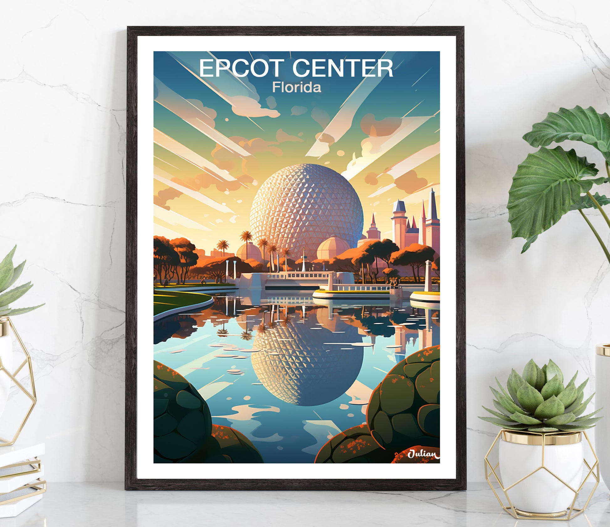 The travel poster of Epcot Center in Florida captures the essence of imagination and innovation that defines this iconic theme park.