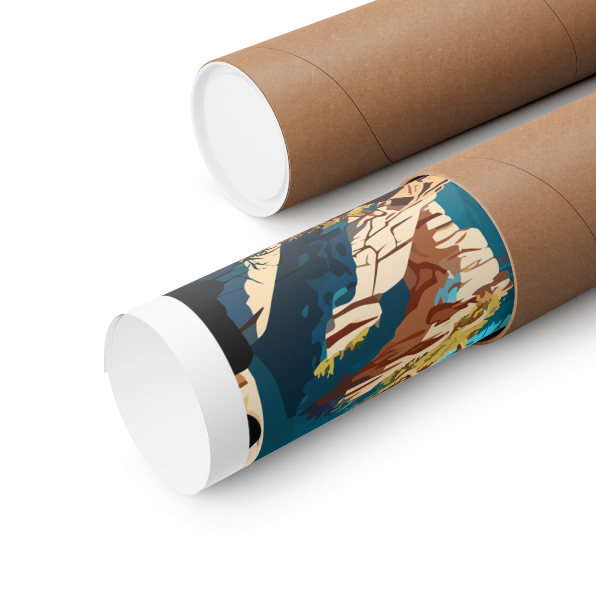 Discover the mysterious depths of the Florida Caverns through this captivating travel poster. Gaze from within the shadowy expanse of a cavern, where stalactites drip from above and rugged walls enclose ancient secrets. The dimly lit interior reveals the fleeting glimpse of bats fluttering and the reflective glow of animal eyes peering from the darkness, adding an air of intrigue.