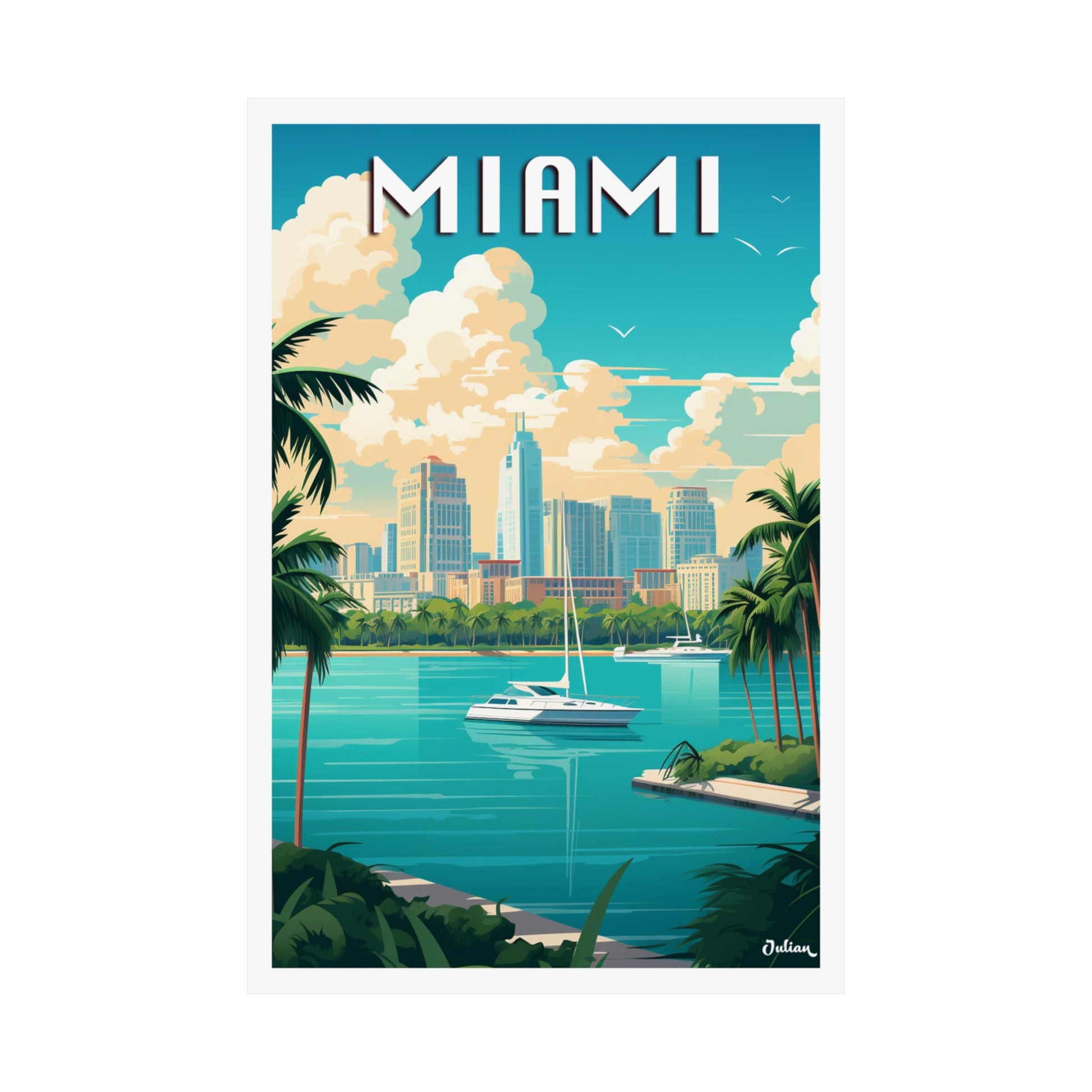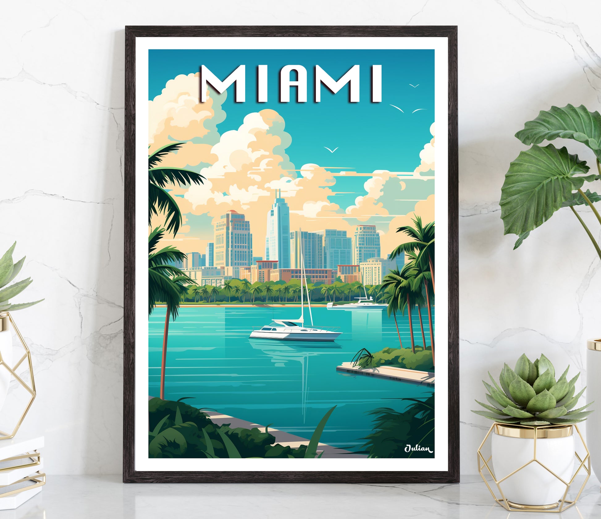 Experience the vibrant allure of Miami, Florida, where luxury and lively culture blend seamlessly against a backdrop of stunning oceanic vistas. Picture a pristine white yacht gliding through the bay, its sleek design epitomizing the opulence that Miami is renowned for. Behind it, the cityscape soars with an array of tall buildings, their modern facades glistening under the radiant Florida sun.