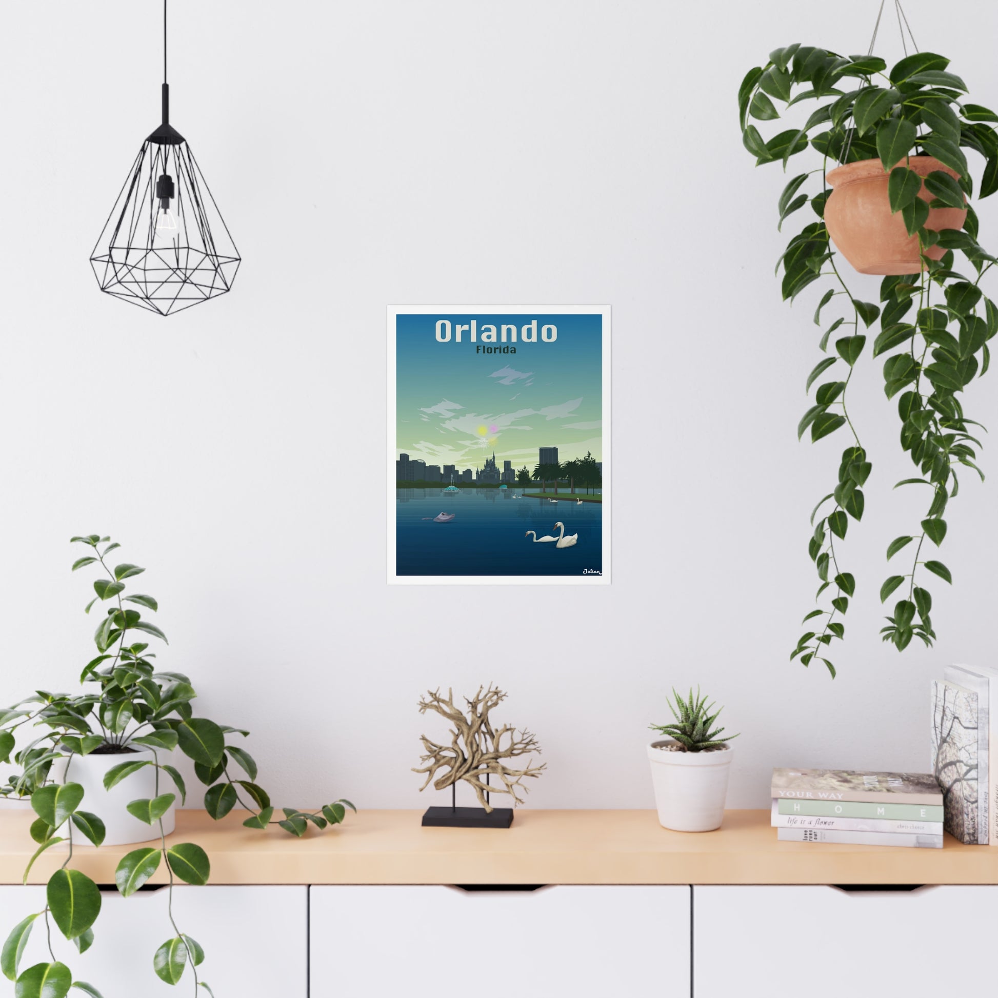 This visually striking piece captures the essence of Orlando's dynamic spirit and scenic beauty. The poster features a panoramic view of the city's iconic skyline, bathed in the warm glow of a Floridian sunset, with the famous Lake Eola fountain in the foreground, symbolizing the city's heart and soul.