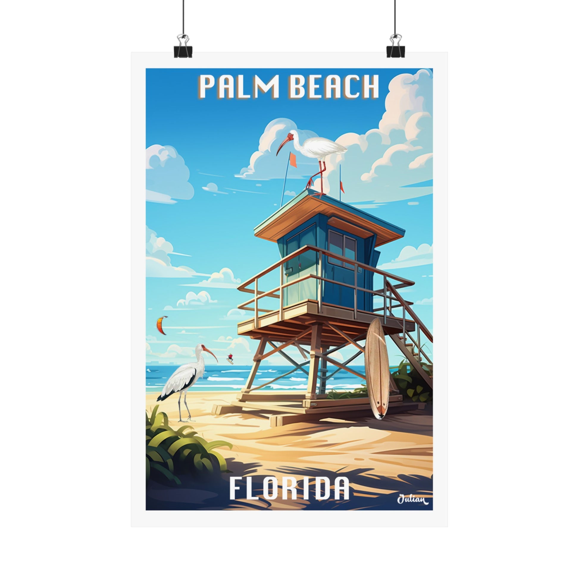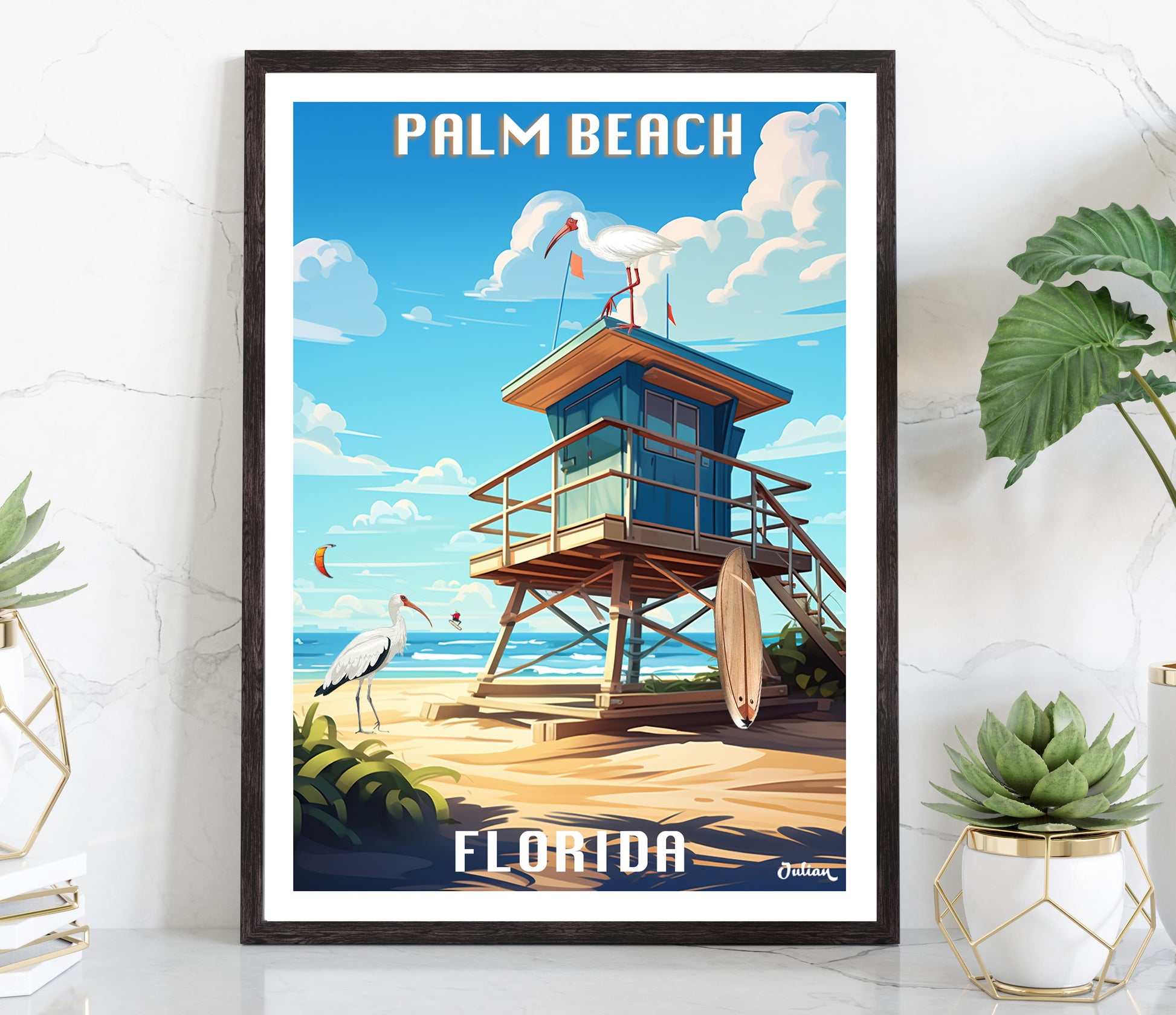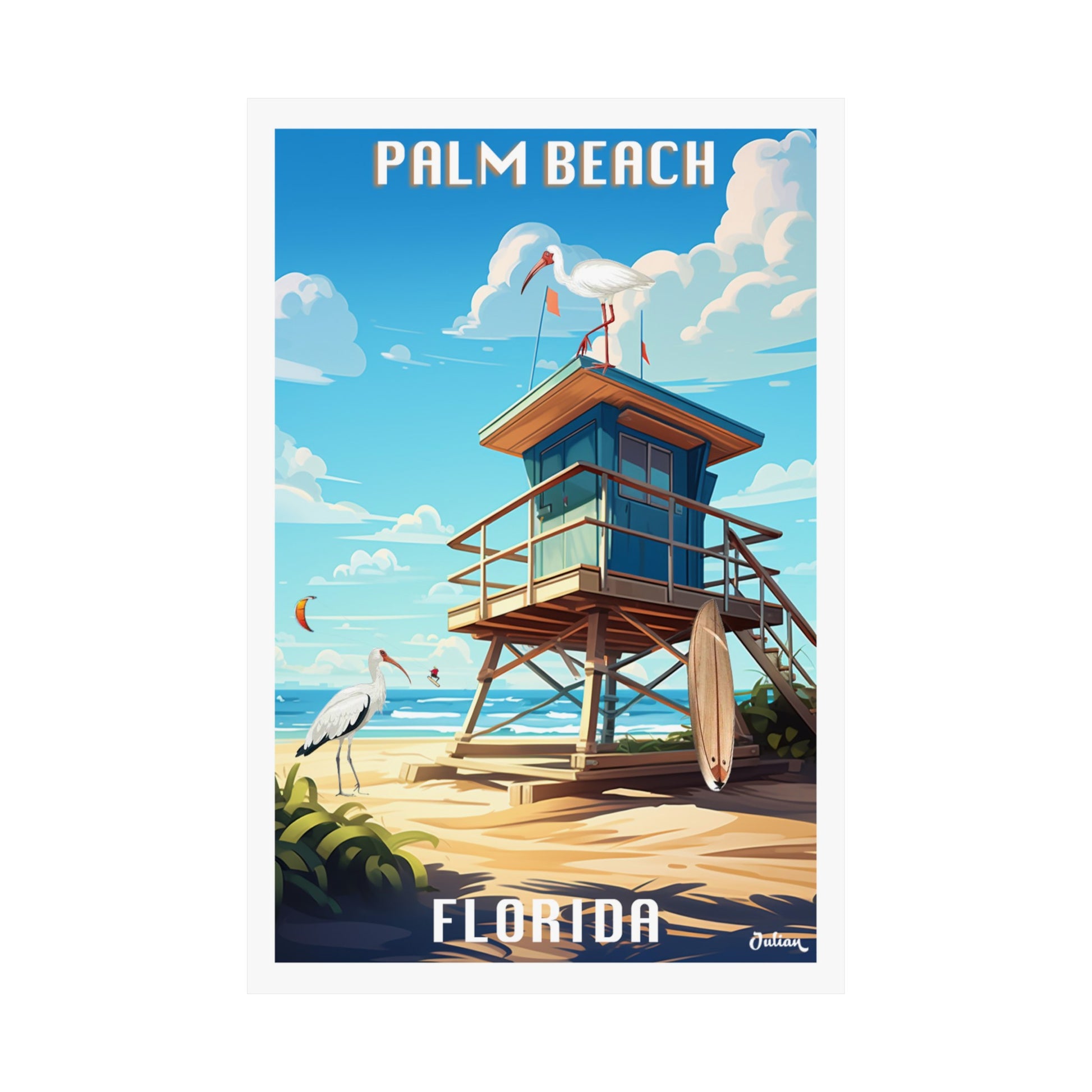 Discover the serene beauty of Palm Beach, Florida, through a striking travel poster. White herons gracefully surround a quaint lifeguard cabin, emblematic of the area's rich wildlife and pristine beaches. The poster captures the tranquil atmosphere of Palm Beach, where the elegance of nature meets the luxury of oceanfront living.