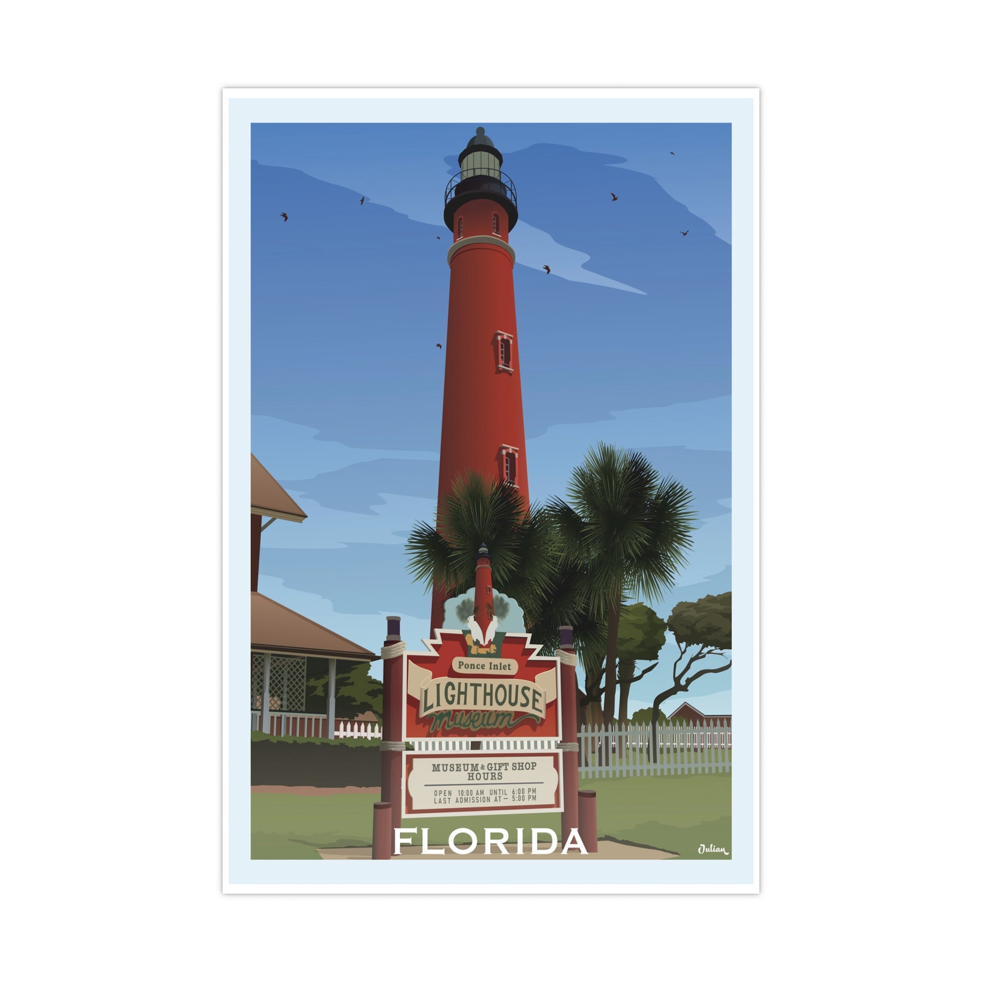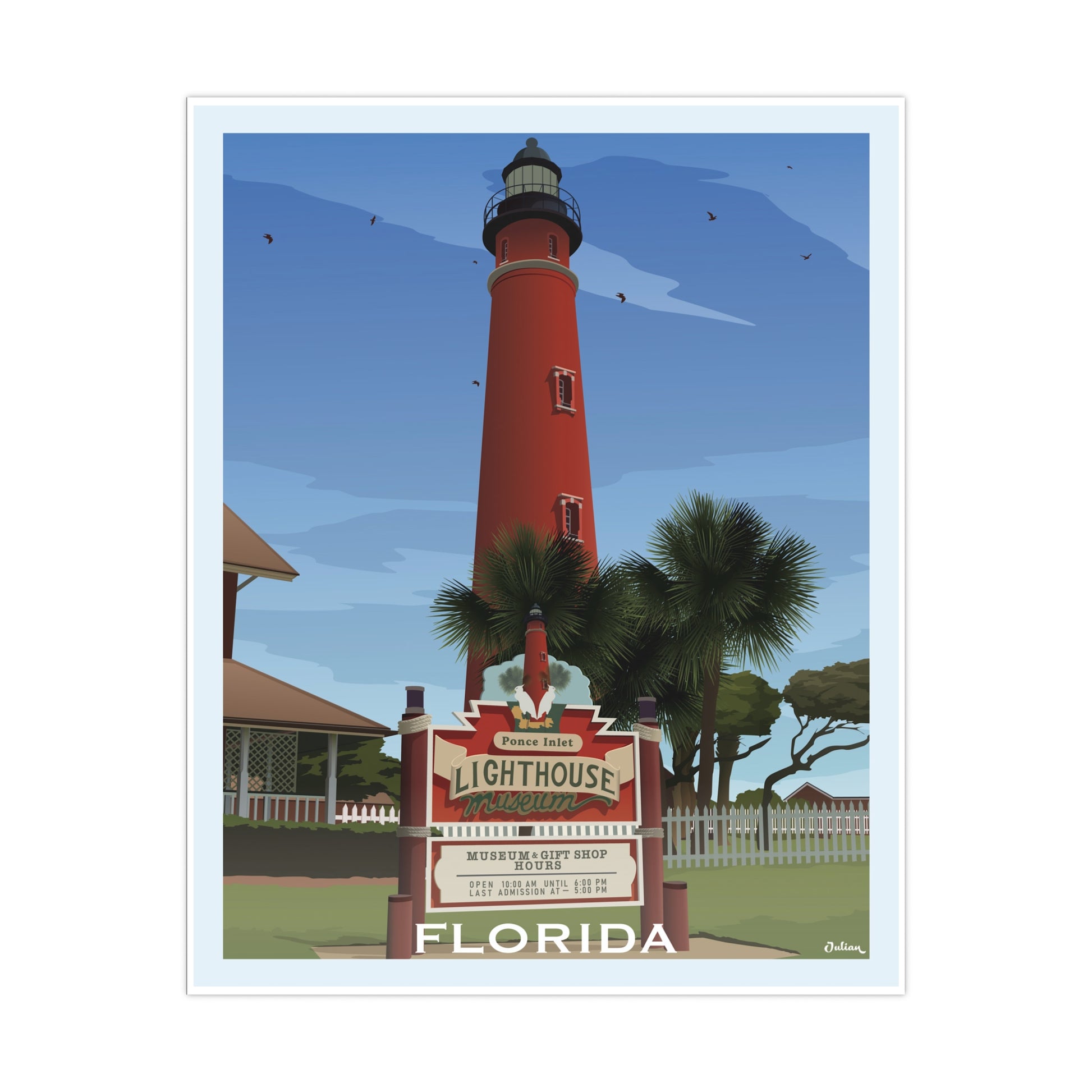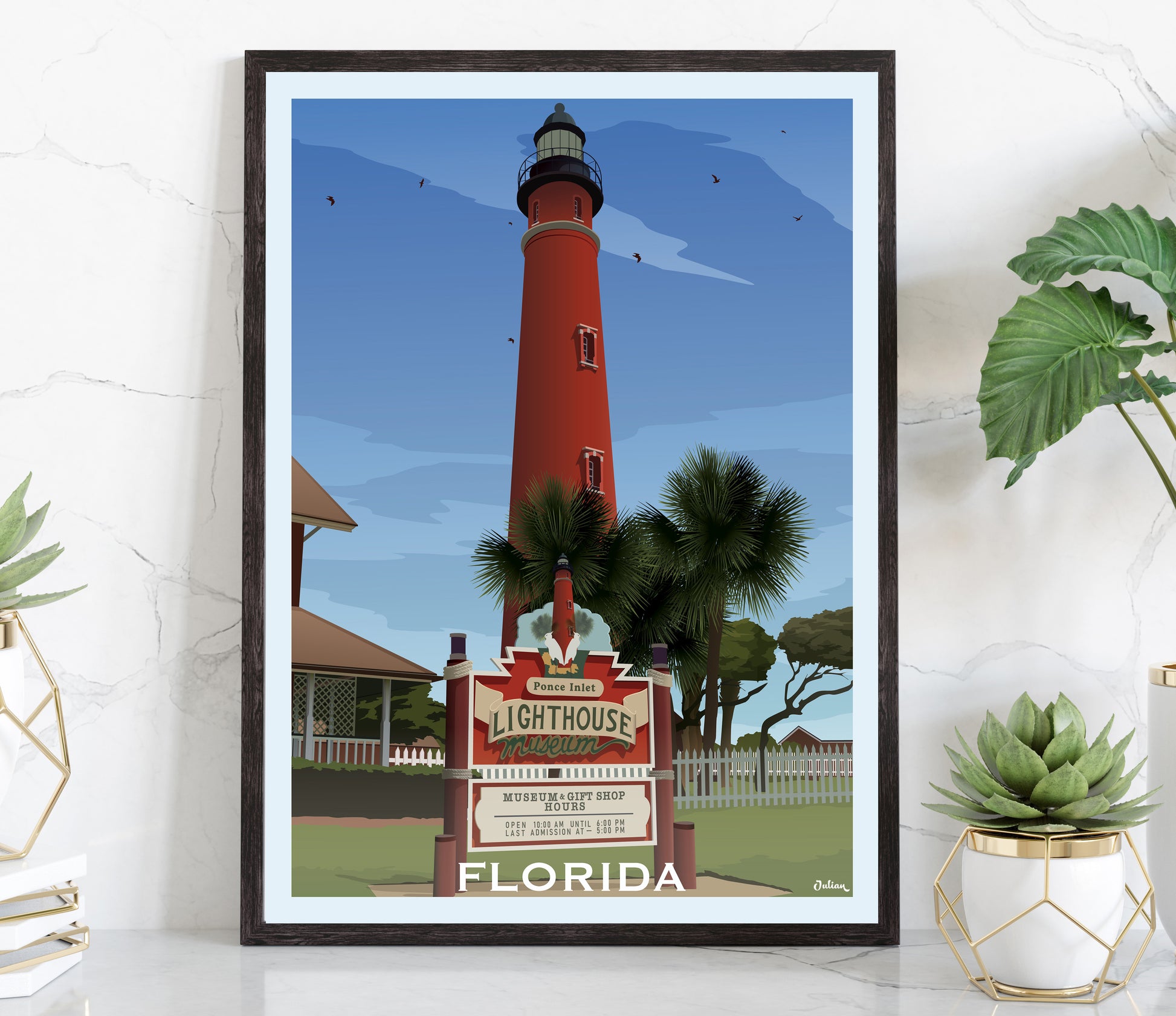 The travel poster featuring the red Ponce Inlet Lighthouse captures the striking elegance and historical significance of this beloved maritime landmark.