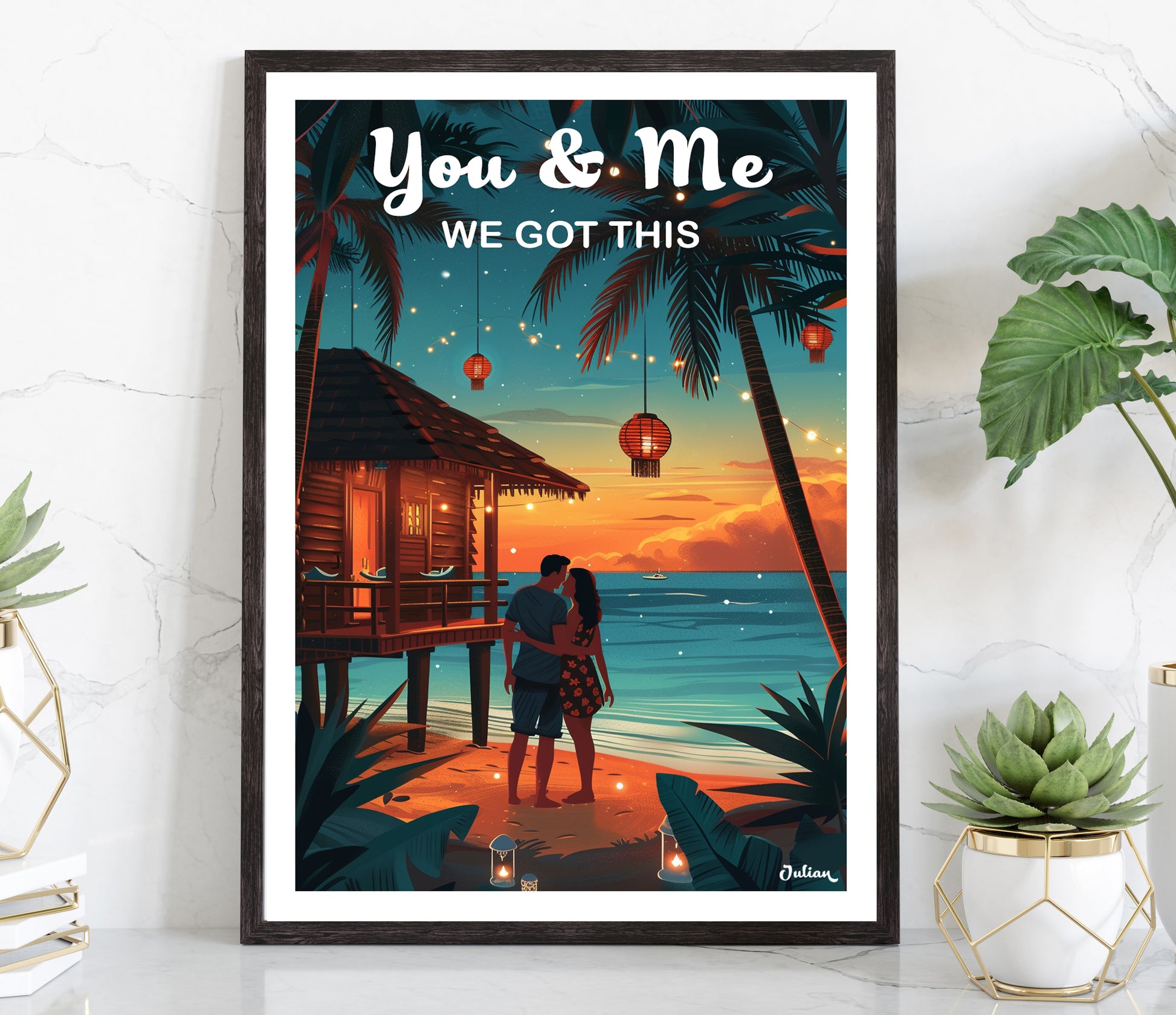The hut, a cozy refuge built above the soft, whispering sands, offers an intimate escape under the canopy of the twilight sky. Surrounding you, lanterns dangle from the swaying branches of nearby palm trees, casting a soft, golden glow that dances across your faces. On the ground, candles flicker with a gentle light, their flames mirroring the stars above, setting the beach aglow with a warm, inviting radiance.