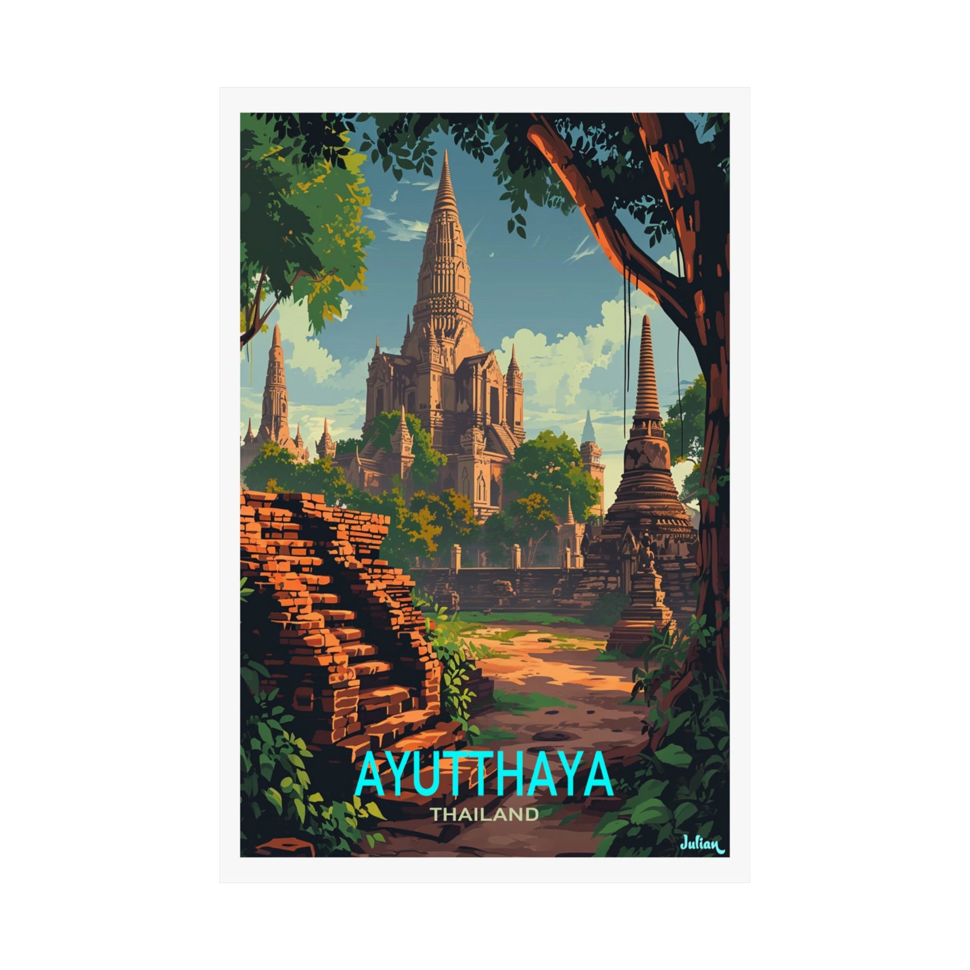 Experience the timeless beauty of Thailand with the "Ayutthaya, Thailand Poster"! This captivating design showcases the ancient ruins of Ayutthaya, a UNESCO World Heritage Site, featuring iconic temples, intricate statues, and serene landscapes. Once the flourishing capital of the Siamese Kingdom, Ayutthaya is a symbol of cultural and historical richness.