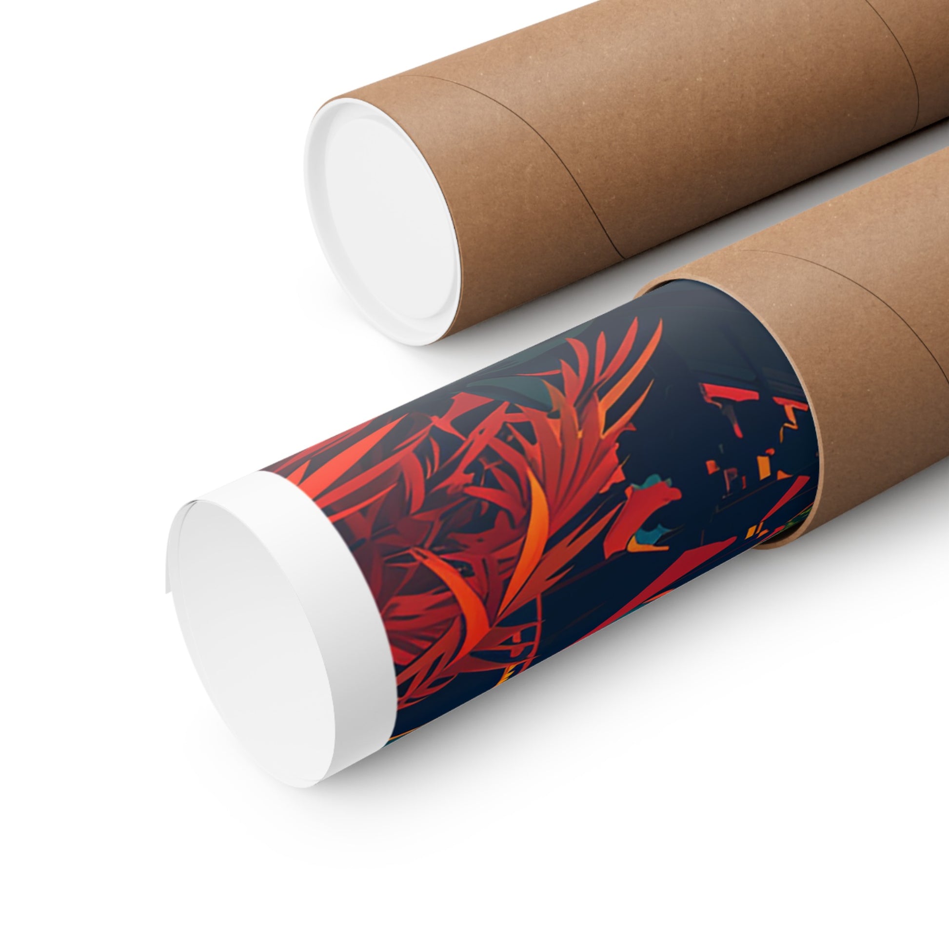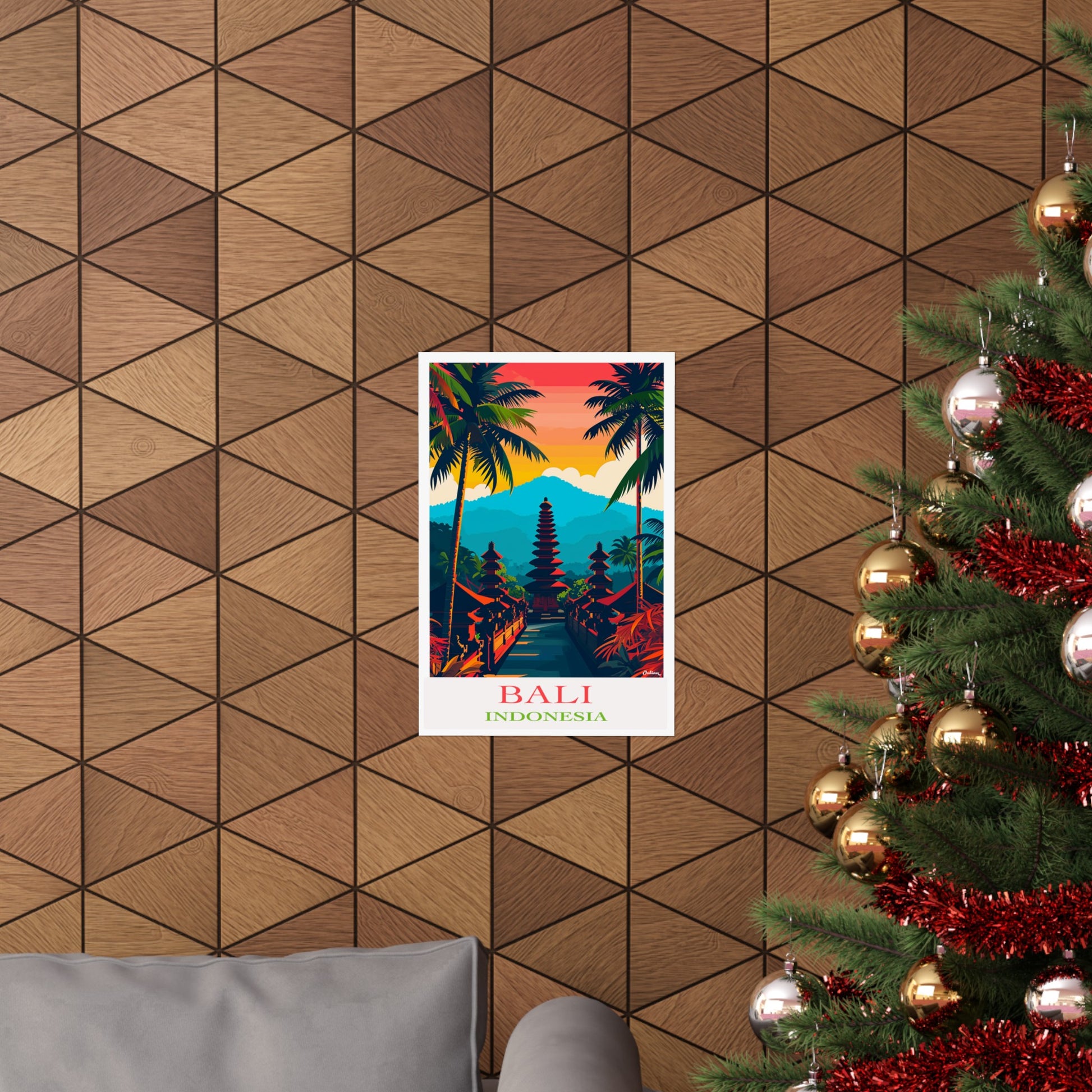 Explore the mystical allure of Bali, Indonesia, through this vibrant travel poster. At the center, a striking red temple stands as a beacon of cultural heritage, surrounded by towering palm trees and a lush, verdant forest. In the background, majestic mountains rise, framing the temple in natural splendor.