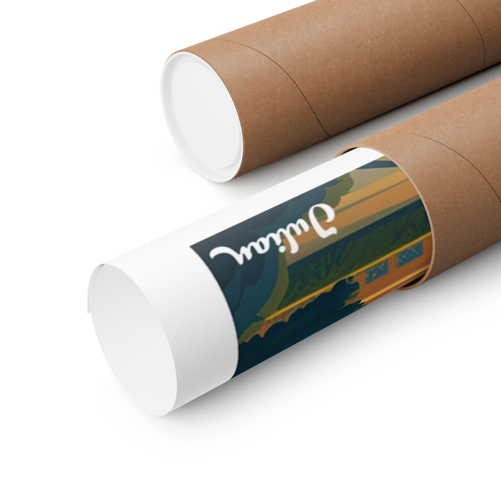 Explore the spiritual grandeur of Thailand's Temple of the Emerald Buddha through this evocative travel poster. Dominating the scene is the magnificent temple, its intricate architecture and shimmering golden spires standing in solemn beauty.