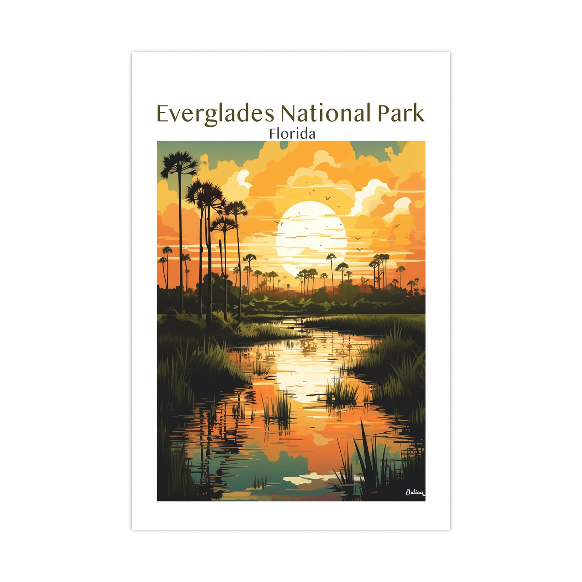 This travel poster of the Everglades in Florida captures a moment of serene beauty at sunset, emphasizing the natural splendor of this unique ecosystem.