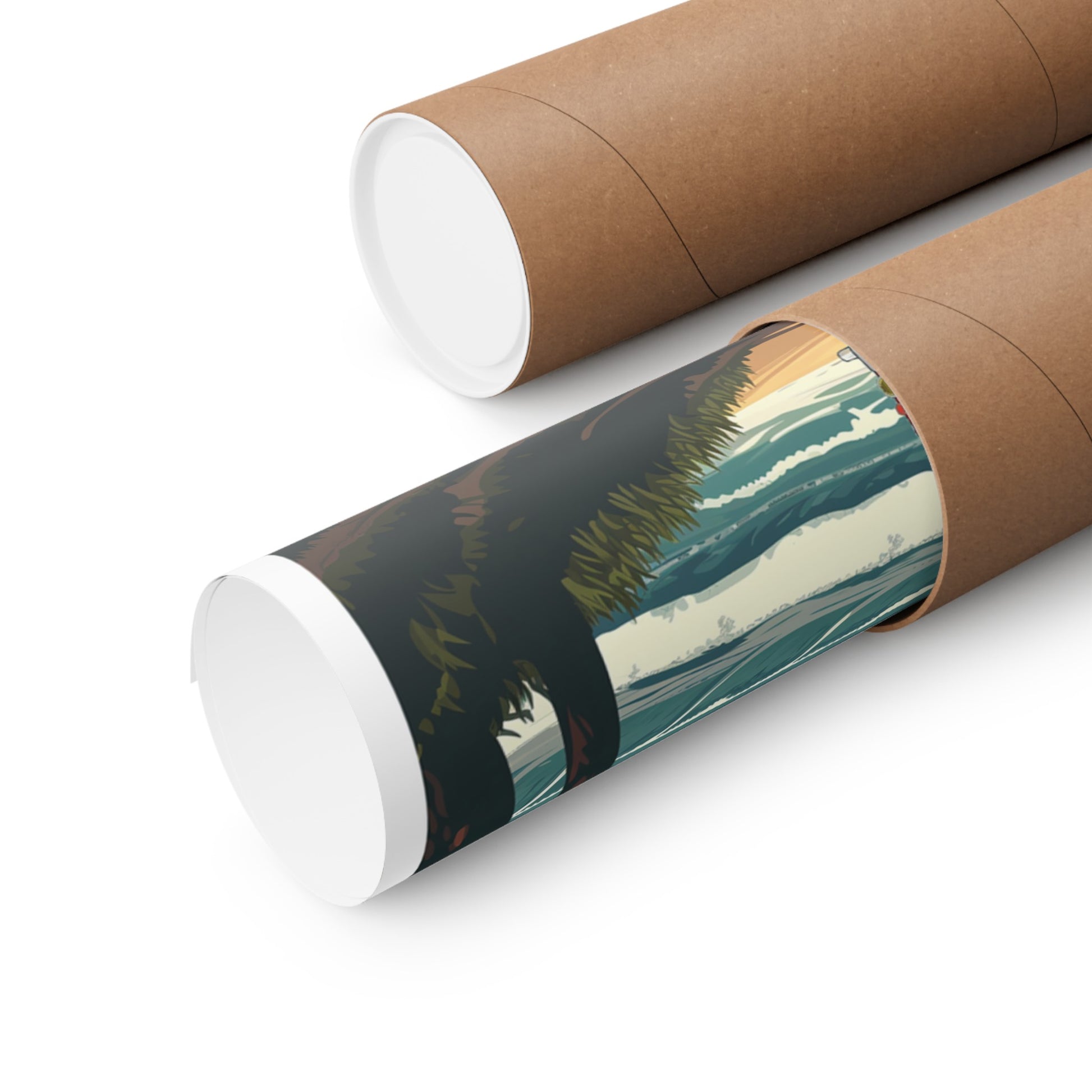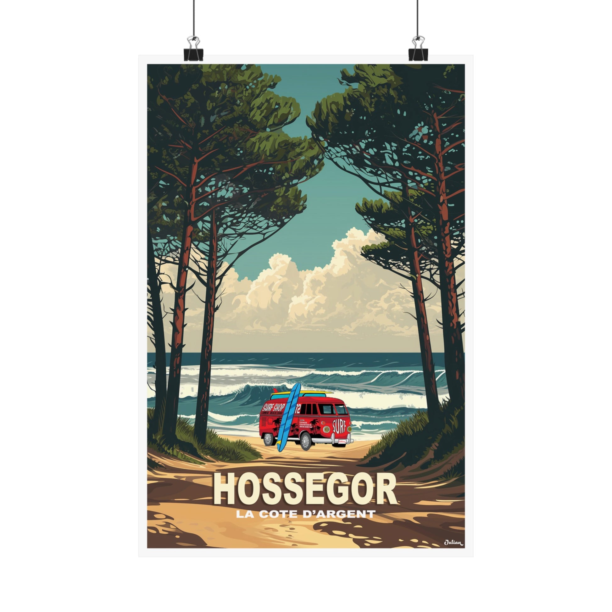 Dive into the surf culture of Hossegor, "La Cote d'Argent," through this vibrant travel poster. At its heart, a classic red VW van, adorned with surfboards, symbolizes freedom and adventure, parked on a sandy beach amidst whispering trees. The powerful waves of the Atlantic crash just steps away, promising thrilling rides and endless excitement.