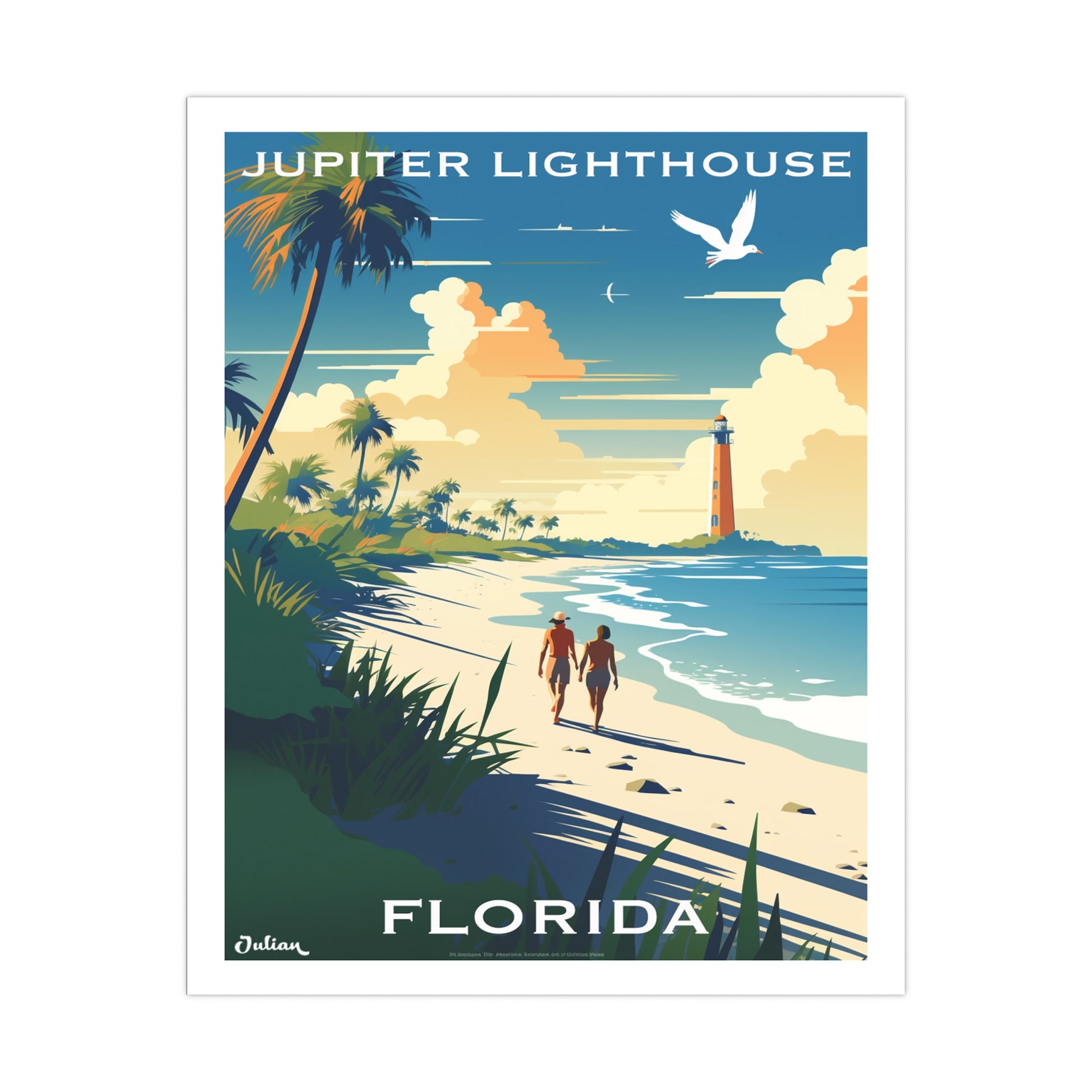 The travel poster of the Jupiter Island Lighthouse in Florida captures the serene beauty and historic charm of this coastal landmark. In the distance, the lighthouse stands tall, its distinctive structure a beacon of guidance and a symbol of the area's rich maritime heritage.